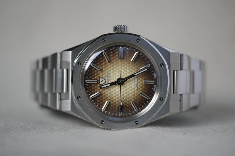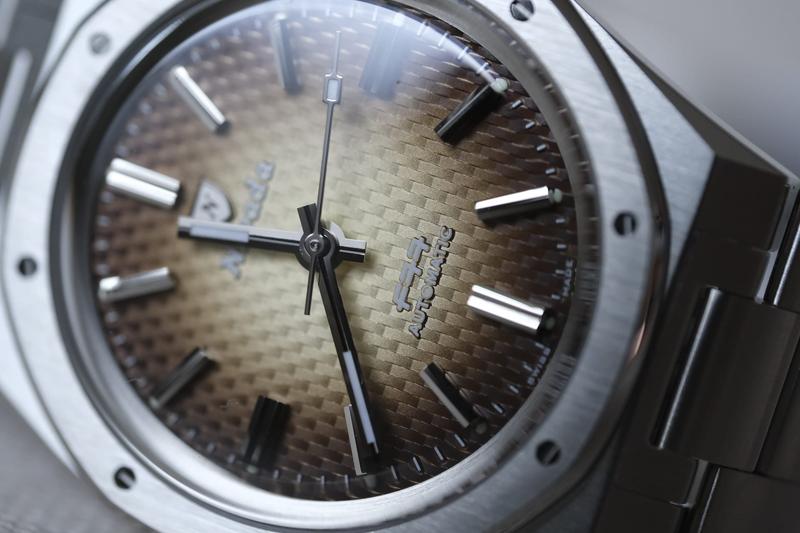 The dial of the F77 has a “carbon effect”, it appears like a basketweave pattern. The outward facing fade from a tobacco beige, to dark brown and then almost black at the edges is quite strong and it appears very differently based on the light situation.