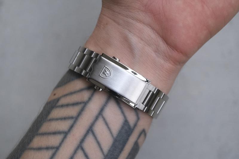 The bracelet has a double-push release system, the fine adjustment of the bracelet can be done through holes in the clasp. Nothing special but it works well and fits the overall design.